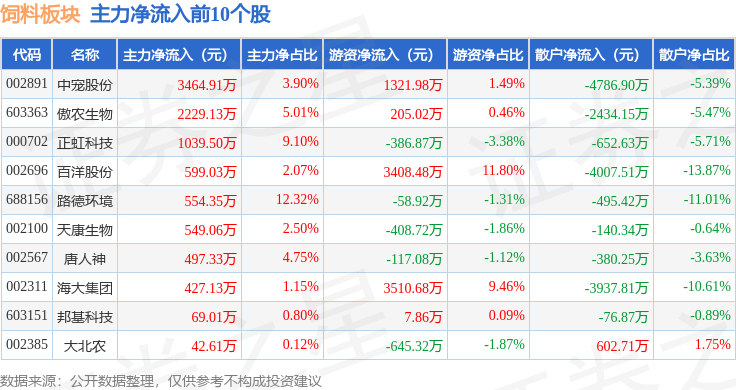 从资金流向上来看,当日饲料板块主力资金净流出2251.92万元,游资资金净流入9199.23万元,散户资金净流出6947.31万元。饲料板块个股资金流向见下表: