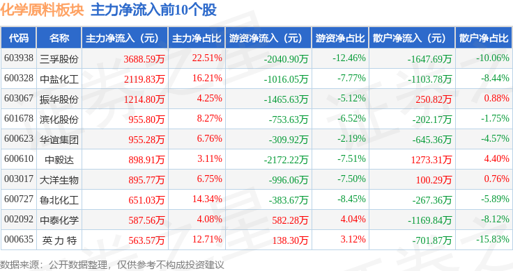 从资金流向上来看,当日化学原料板块主力资金净流出7695.5万元,游资资金净流出7791.99万元,散户资金净流入1.55亿元。化学原料板块个股资金流向见下表: