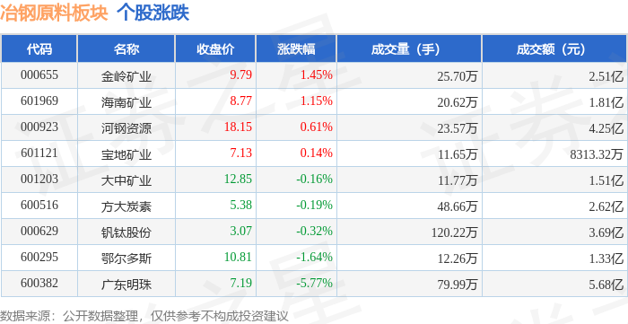 证券之星消息,10月15日冶钢原料板块较上一交易日下跌0.33%,广东明珠领跌。当日上证指数报收于3912.21,上涨1.22%。深证成指报收于13118.75,上涨1.73%。冶钢原料板块个股涨跌见下表: