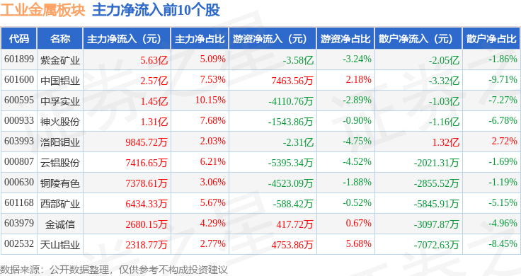 从资金流向上来看,当日工业金属板块主力资金净流出6.82亿元,游资资金净流出3.1亿元,散户资金净流入9.91亿元。工业金属板块个股资金流向见下表: