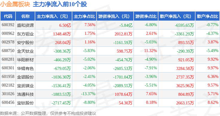 从资金流向上来看,当日小金属板块主力资金净流出20.92亿元,游资资金净流出1.73亿元,散户资金净流入22.65亿元。小金属板块个股资金流向见下表: