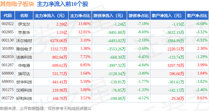 从资金流向上来看,当日其他电子板块主力资金净流入2196.38万元,游资资金净流出3.96亿元,散户资金净流入3.74亿元。其他电子板块个股资金流向见下表: