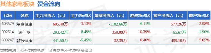 从资金流向上来看,当日其他家电板块主力资金净流出129.51万元,游资资金净流出791.18万元,散户资金净流入920.69万元。其他家电板块个股资金流向见下表: