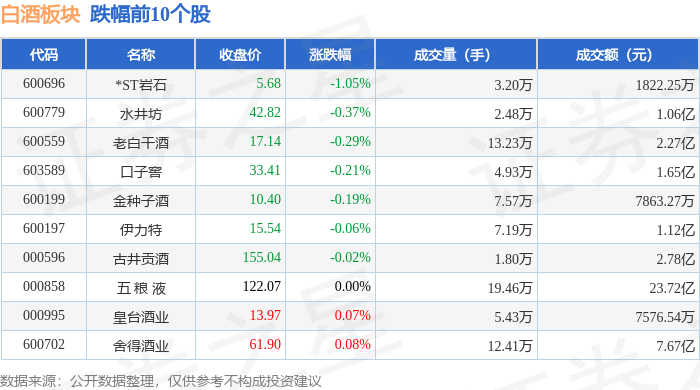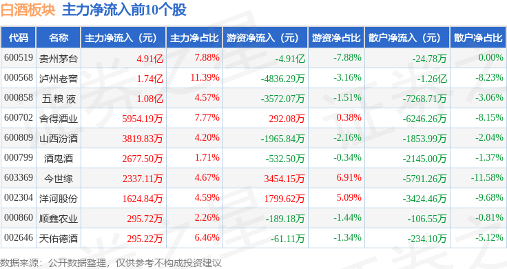 从资金流向上来看,当日白酒板块主力资金净流入8.84亿元,游资资金净流出5.33亿元,散户资金净流出3.51亿元。白酒板块个股资金流向见下表: