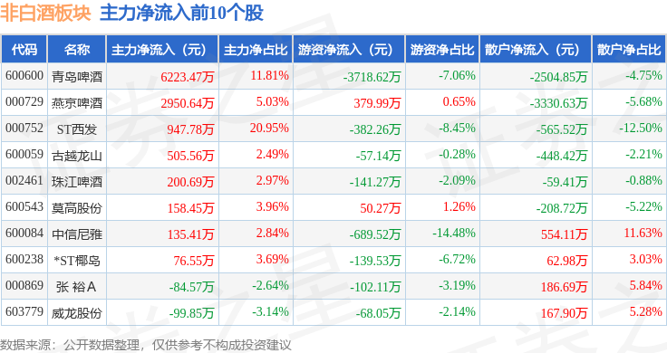 从资金流向上来看,当日非白酒板块主力资金净流入7328.85万元,游资资金净流出1.06亿元,散户资金净流入3251.92万元。非白酒板块个股资金流向见下表: