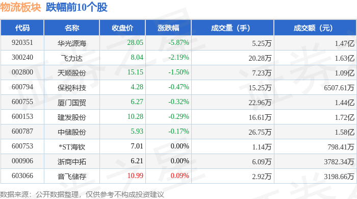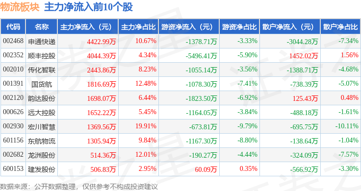 从资金流向上来看,当日物流板块主力资金净流入3803.61万元,游资资金净流出9136.68万元,散户资金净流入5333.07万元。物流板块个股资金流向见下表: