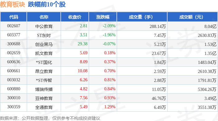 证券之星消息,10月15日教育板块较上一交易日上涨0.79%,中国高科领涨。当日上证指数报收于3912.21,上涨1.22%。深证成指报收于13118.75,上涨1.73%。教育板块个股涨跌见下表: