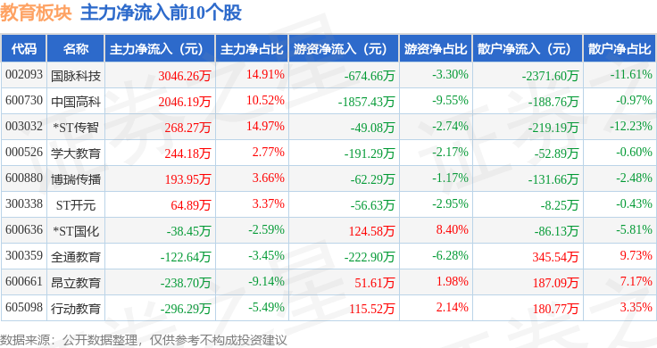 从资金流向上来看,当日教育板块主力资金净流出1.73亿元,游资资金净流入3176.62万元,散户资金净流入1.42亿元。教育板块个股资金流向见下表:
