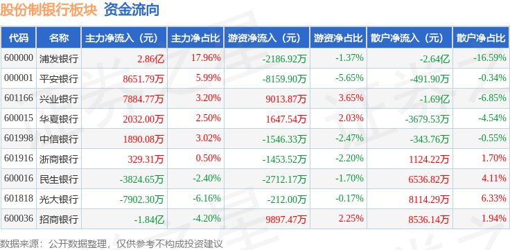 从资金流向上来看,当日股份制银行板块主力资金净流入1.92亿元,游资资金净流入4288.04万元,散户资金净流出2.35亿元。股份制银行板块个股资金流向见下表: