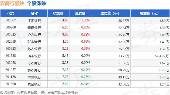 从资金流向上来看,当日农商行板块主力资金净流入722.01万元,游资资金净流出7805.35万元,散户资金净流入7083.34万元。农商行板块个股资金流向见下表: