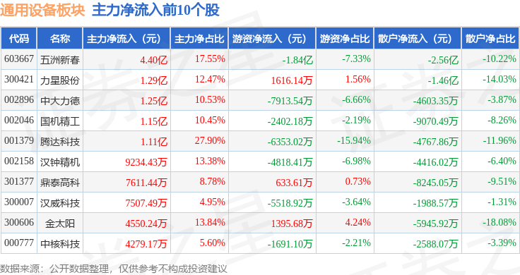 从资金流向上来看,当日通用设备板块主力资金净流入2.25亿元,游资资金净流出5.03亿元,散户资金净流入2.77亿元。通用设备板块个股资金流向见下表: