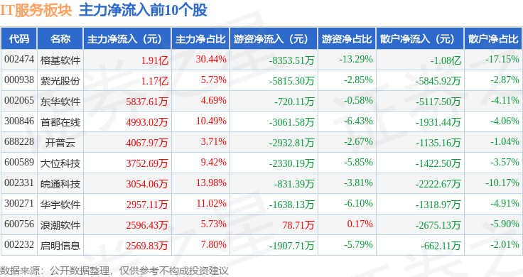 从资金流向上来看,当日IT服务板块主力资金净流出627.85万元,游资资金净流出5.96亿元,散户资金净流入6.03亿元。IT服务板块个股资金流向见下表: