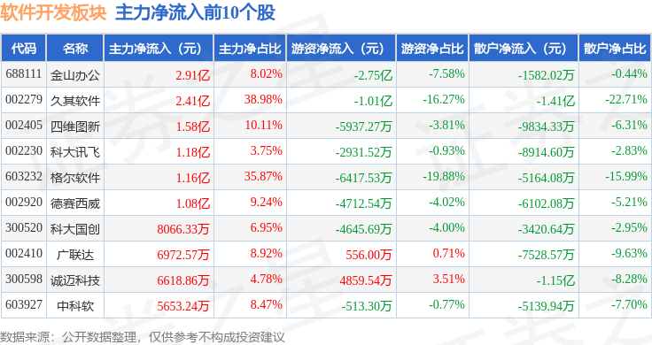 从资金流向上来看,当日软件开发板块主力资金净流入8.93亿元,游资资金净流出8.15亿元,散户资金净流出7785.29万元。软件开发板块个股资金流向见下表: