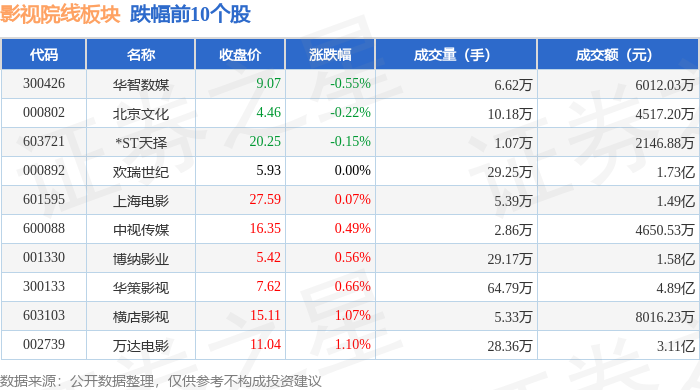 证券之星消息,10月15日影视院线板块较上一交易日上涨1.22%,慈文传媒领涨。当日上证指数报收于3912.21,上涨1.22%。深证成指报收于13118.75,上涨1.73%。影视院线板块个股涨跌见下表:
