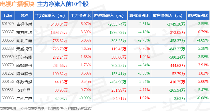 从资金流向上来看,当日电视广播板块主力资金净流入3873.86万元,游资资金净流出4486.43万元,散户资金净流入612.56万元。电视广播板块个股资金流向见下表: