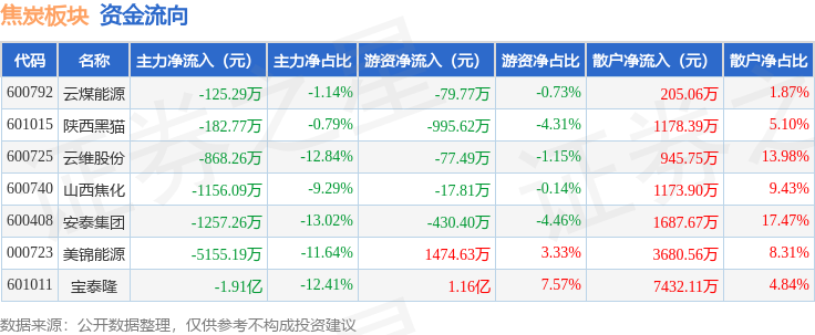 从资金流向上来看,当日焦炭板块主力资金净流出2.78亿元,游资资金净流入1.15亿元,散户资金净流入1.63亿元。焦炭板块个股资金流向见下表: