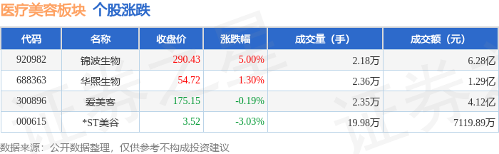 证券之星消息,10月15日医疗美容板块较上一交易日上涨0.28%,锦波生物领涨。当日上证指数报收于3912.21,上涨1.22%。深证成指报收于13118.75,上涨1.73%。医疗美容板块个股涨跌见下表: