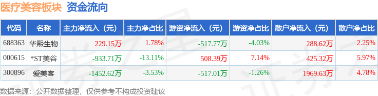 从资金流向上来看,当日医疗美容板块主力资金净流出2157.18万元,游资资金净流出526.39万元,散户资金净流入2683.57万元。医疗美容板块个股资金流向见下表: