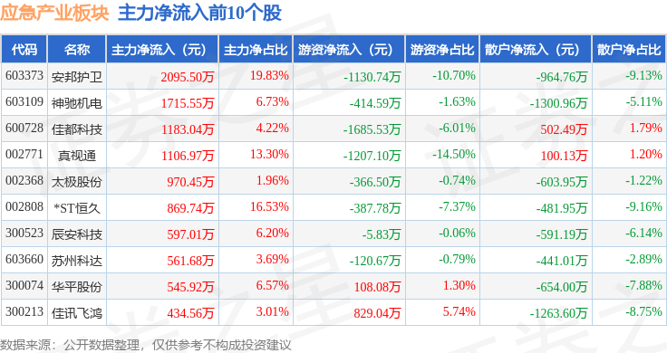 从资金流向上来看,当日应急产业板块主力资金净流出2.82亿元,游资资金净流出1.19亿元,散户资金净流入4.01亿元。应急产业板块个股资金流向见下表:
