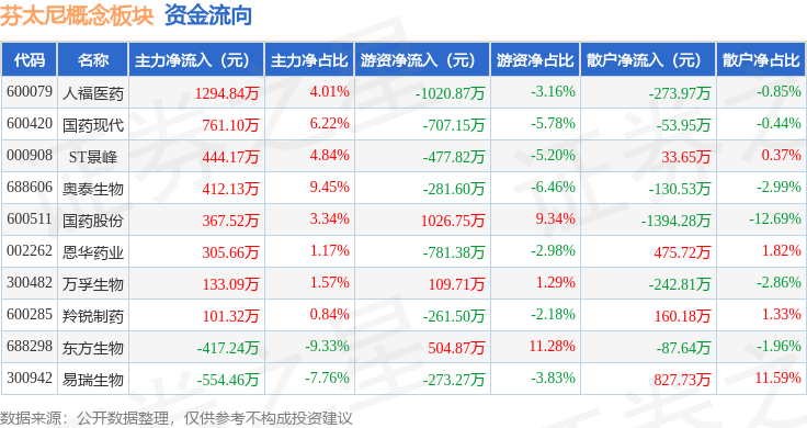 从资金流向上来看,当日芬太尼概念板块主力资金净流入2848.14万元,游资资金净流出2162.26万元,散户资金净流出685.88万元。芬太尼概念板块个股资金流向见下表: