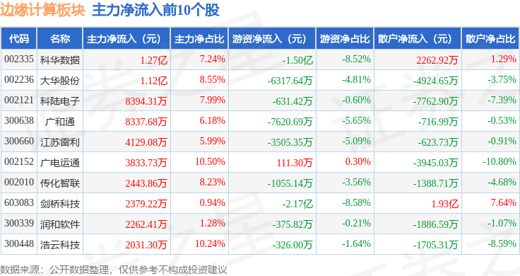 从资金流向上来看,当日边缘计算板块主力资金净流出9.75亿元,游资资金净流出4.15亿元,散户资金净流入13.9亿元。边缘计算板块个股资金流向见下表: