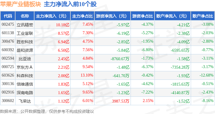 从资金流向上来看,当日苹果产业链板块主力资金净流入20.62亿元,游资资金净流出25.42亿元,散户资金净流入4.8亿元。苹果产业链板块个股资金流向见下表: