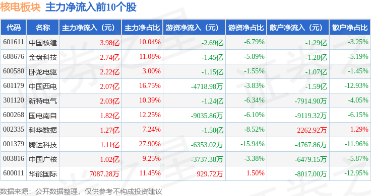 从资金流向上来看,当日核电板块主力资金净流出5.76亿元,游资资金净流出13.18亿元,散户资金净流入18.95亿元。核电板块个股资金流向见下表: