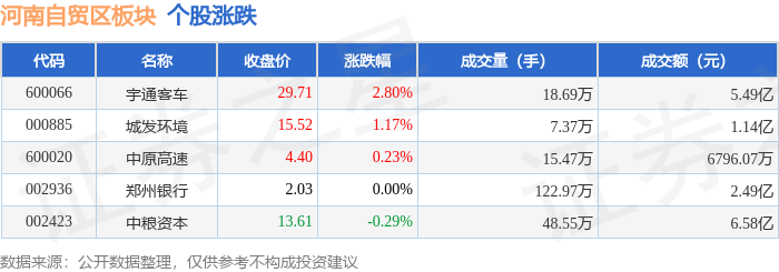 证券之星消息,10月15日河南自贸区板块较上一交易日上涨1.43%,宇通客车领涨。当日上证指数报收于3912.21,上涨1.22%。深证成指报收于13118.75,上涨1.73%。河南自贸区板块个股涨跌见下表: