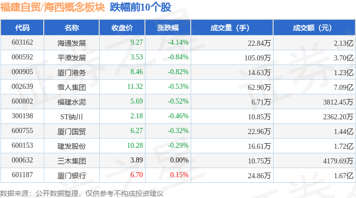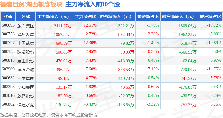 从资金流向上来看,当日福建自贸/海西概念板块主力资金净流出1.27亿元,游资资金净流出1874.55万元,散户资金净流入1.46亿元。福建自贸/海西概念板块个股资金流向见下表: