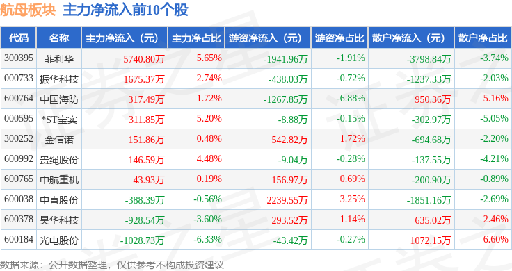 从资金流向上来看,当日航母板块主力资金净流出7.91亿元,游资资金净流入3.2亿元,散户资金净流入4.71亿元。航母板块个股资金流向见下表: