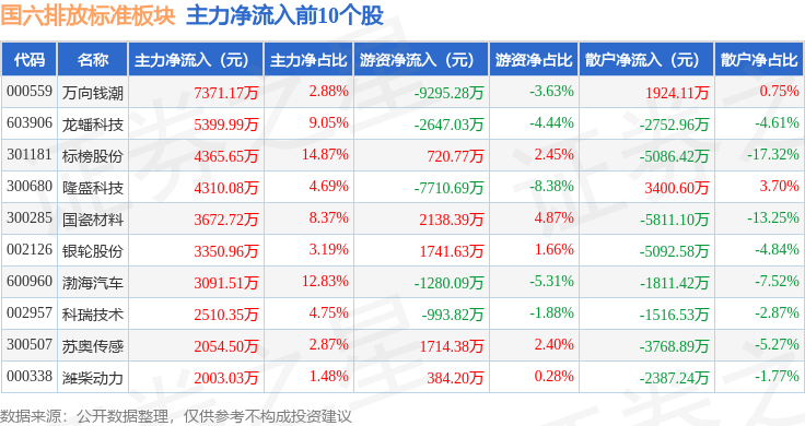 从资金流向上来看,当日国六排放标准板块主力资金净流入1.46亿元,游资资金净流出1.52亿元,散户资金净流入599.06万元。国六排放标准板块个股资金流向见下表: