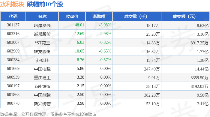 从资金流向上来看,当日水利板块主力资金净流入4.75亿元,游资资金净流出4.01亿元,散户资金净流出7417.18万元。水利板块个股资金流向见下表: