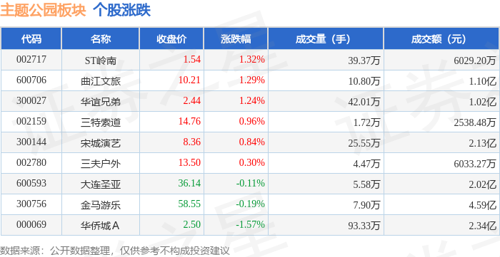 证券之星消息,10月15日主题公园板块较上一交易日上涨0.05%,ST岭南领涨。当日上证指数报收于3912.21,上涨1.22%。深证成指报收于13118.75,上涨1.73%。主题公园板块个股涨跌见下表: