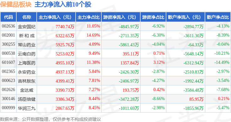 从资金流向上来看,当日保健品板块主力资金净流入5.65亿元,游资资金净流出2.1亿元,散户资金净流出3.55亿元。保健品板块个股资金流向见下表: