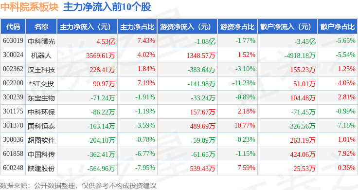 从资金流向上来看,当日中科院系板块主力资金净流入2.06亿元,游资资金净流出1.09亿元,散户资金净流出9704.92万元。中科院系板块个股资金流向见下表: