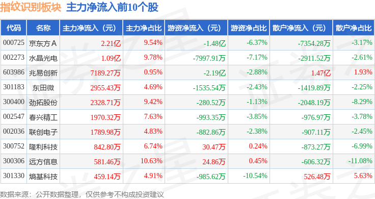 从资金流向上来看,当日指纹识别板块主力资金净流入1.11亿元,游资资金净流出2.96亿元,散户资金净流入1.85亿元。指纹识别板块个股资金流向见下表: