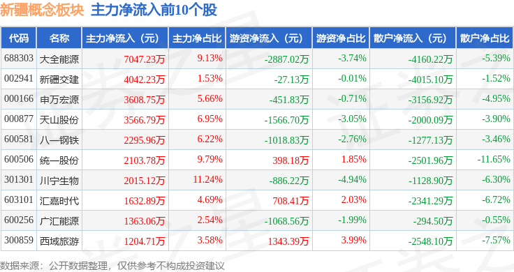 从资金流向上来看,当日新疆概念板块主力资金净流出6.97亿元,游资资金净流出2056.95万元,散户资金净流入7.17亿元。新疆概念板块个股资金流向见下表: