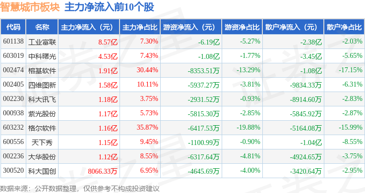 从资金流向上来看,当日智慧城市板块主力资金净流入9.29亿元,游资资金净流出14.36亿元,散户资金净流入5.07亿元。智慧城市板块个股资金流向见下表: