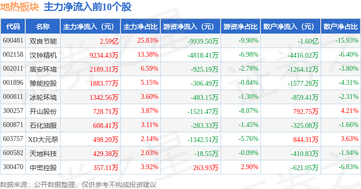 从资金流向上来看,当日地热板块主力资金净流入3.46亿元,游资资金净流出1.9亿元,散户资金净流出1.56亿元。地热板块个股资金流向见下表: