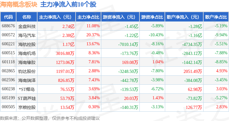 从资金流向上来看,当日海南概念板块主力资金净流入3.39亿元,游资资金净流出3.12亿元,散户资金净流出2661.65万元。海南概念板块个股资金流向见下表: