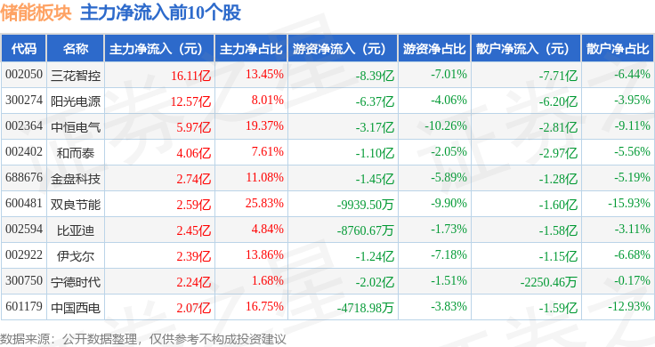 从资金流向上来看,当日储能板块主力资金净流入22.32亿元,游资资金净流出38.5亿元,散户资金净流入16.18亿元。储能板块个股资金流向见下表: