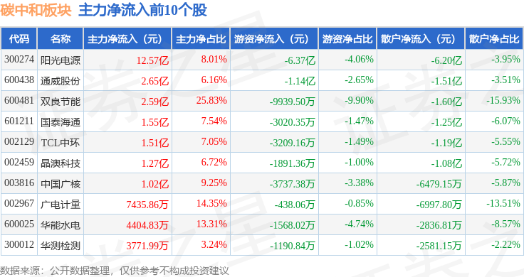 从资金流向上来看,当日碳中和板块主力资金净流入12.99亿元,游资资金净流出9.94亿元,散户资金净流出3.05亿元。碳中和板块个股资金流向见下表: