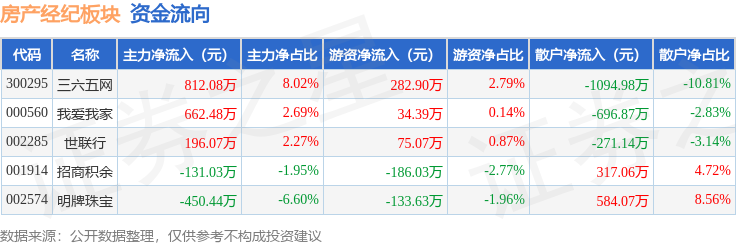 从资金流向上来看,当日房产经纪板块主力资金净流入1089.17万元,游资资金净流入72.7万元,散户资金净流出1161.87万元。房产经纪板块个股资金流向见下表: