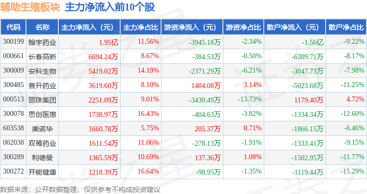 从资金流向上来看,当日辅助生殖板块主力资金净流入3.94亿元,游资资金净流出1.62亿元,散户资金净流出2.33亿元。辅助生殖板块个股资金流向见下表: