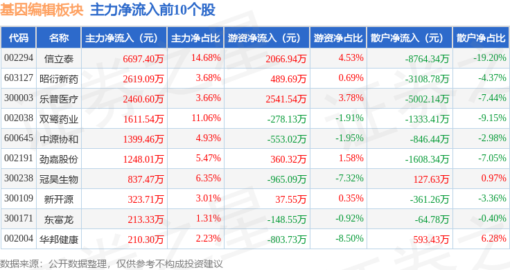 从资金流向上来看,当日基因编辑板块主力资金净流入1.75亿元,游资资金净流入3658.32万元,散户资金净流出2.11亿元。基因编辑板块个股资金流向见下表: