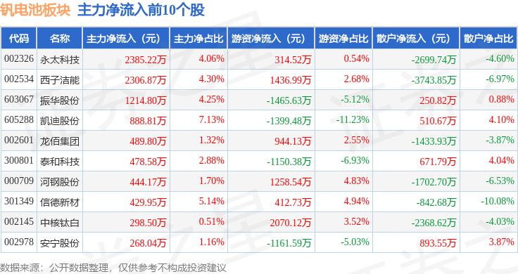 从资金流向上来看,当日钒电池板块主力资金净流出9.82亿元,游资资金净流入2.44亿元,散户资金净流入7.38亿元。钒电池板块个股资金流向见下表: