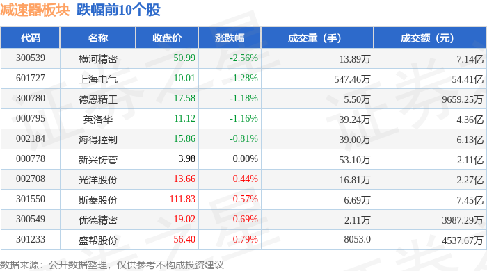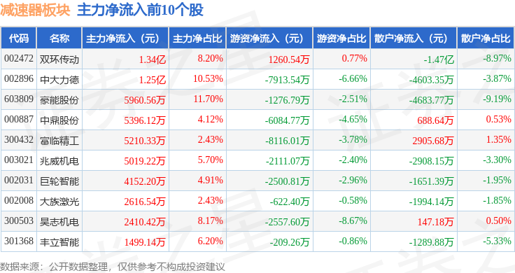 从资金流向上来看,当日减速器板块主力资金净流出1.06亿元,游资资金净流出3.97亿元,散户资金净流入5.03亿元。减速器板块个股资金流向见下表: