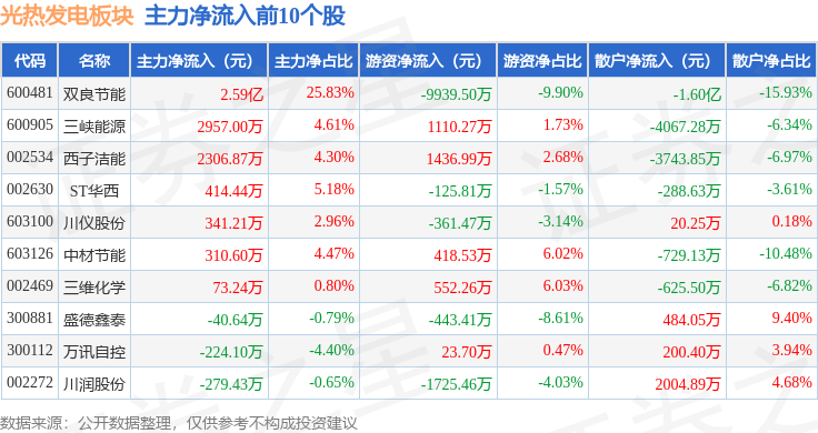 从资金流向上来看,当日光热发电板块主力资金净流出3.18亿元,游资资金净流出1.59亿元,散户资金净流入4.77亿元。光热发电板块个股资金流向见下表: