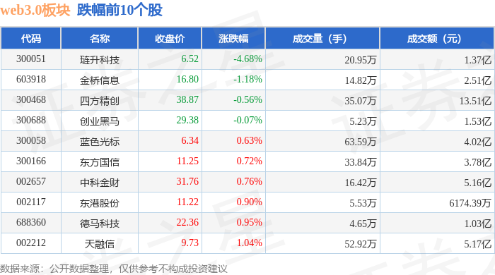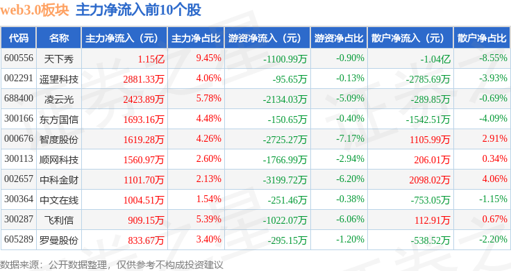 从资金流向上来看,当日web3.0板块主力资金净流出1.09亿元,游资资金净流出1.41亿元,散户资金净流入2.5亿元。web3.0板块个股资金流向见下表: