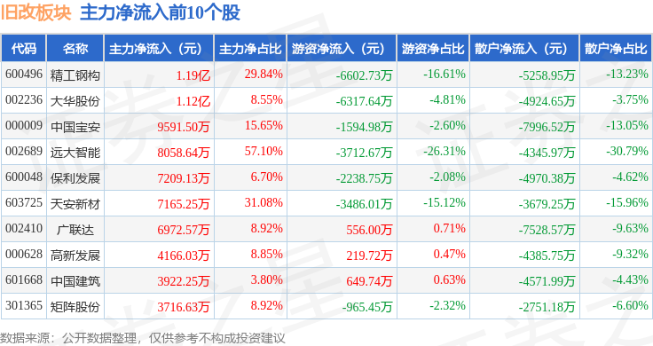 从资金流向上来看,当日旧改板块主力资金净流入2.67亿元,游资资金净流出2.91亿元,散户资金净流入2425.0万元。旧改板块个股资金流向见下表: